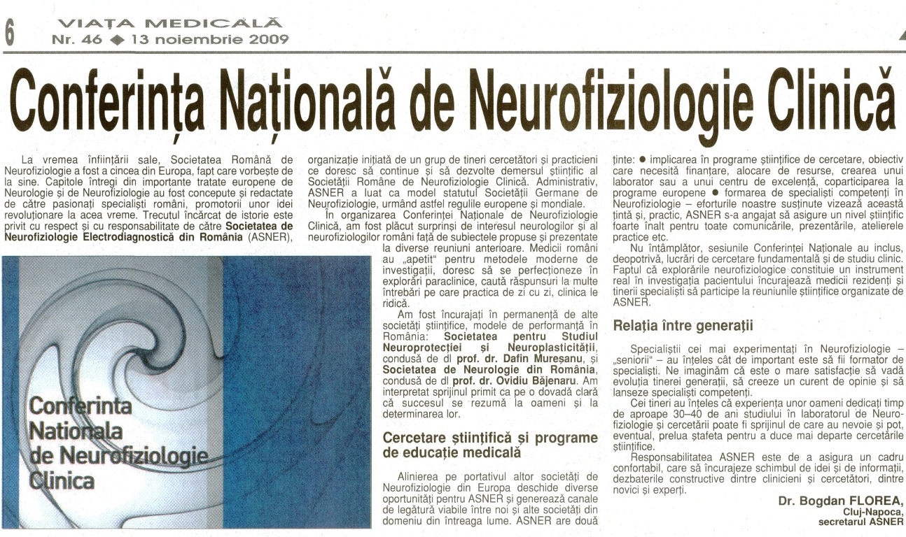 Săptamânalul medico-sanitar de cea mai mare circulație națională, „Viața Medicală”, a publicat în Nr. 46 (1036) din 13 Noiembrie 2009 un editorial despre conferința ASNER 2009.